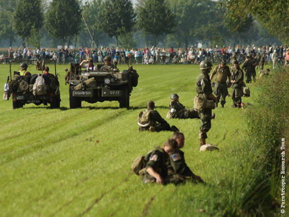 Living History in actions: paratroopers securing the edge of the Dropzone while veterans are arriving (Ray Nagel B-Battery 321st GFAB)