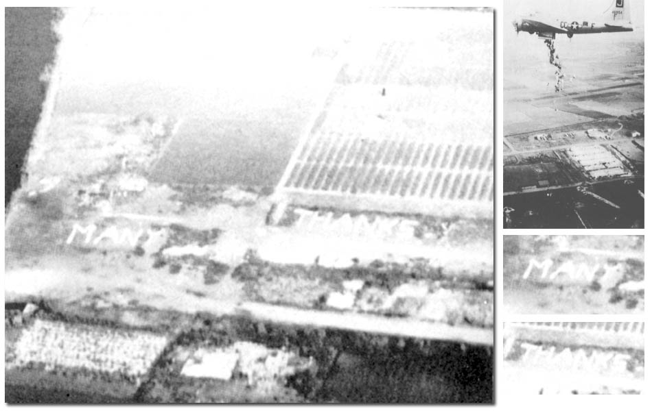 De dankbaarheid van de Nederlandse bevolking is op de grond af te lezen op deze foto. Tonnen voedsel werden gedropt.