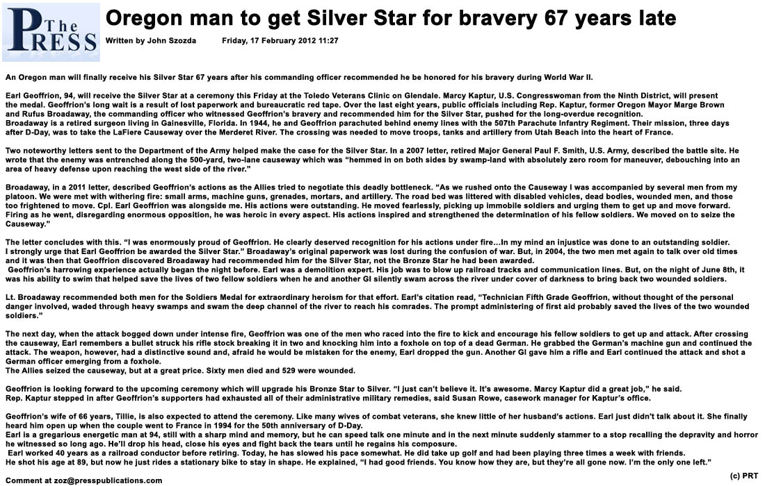 military personnel, where Earl will be presented the Silver Star Medal. Thank you all for your time & efforts,