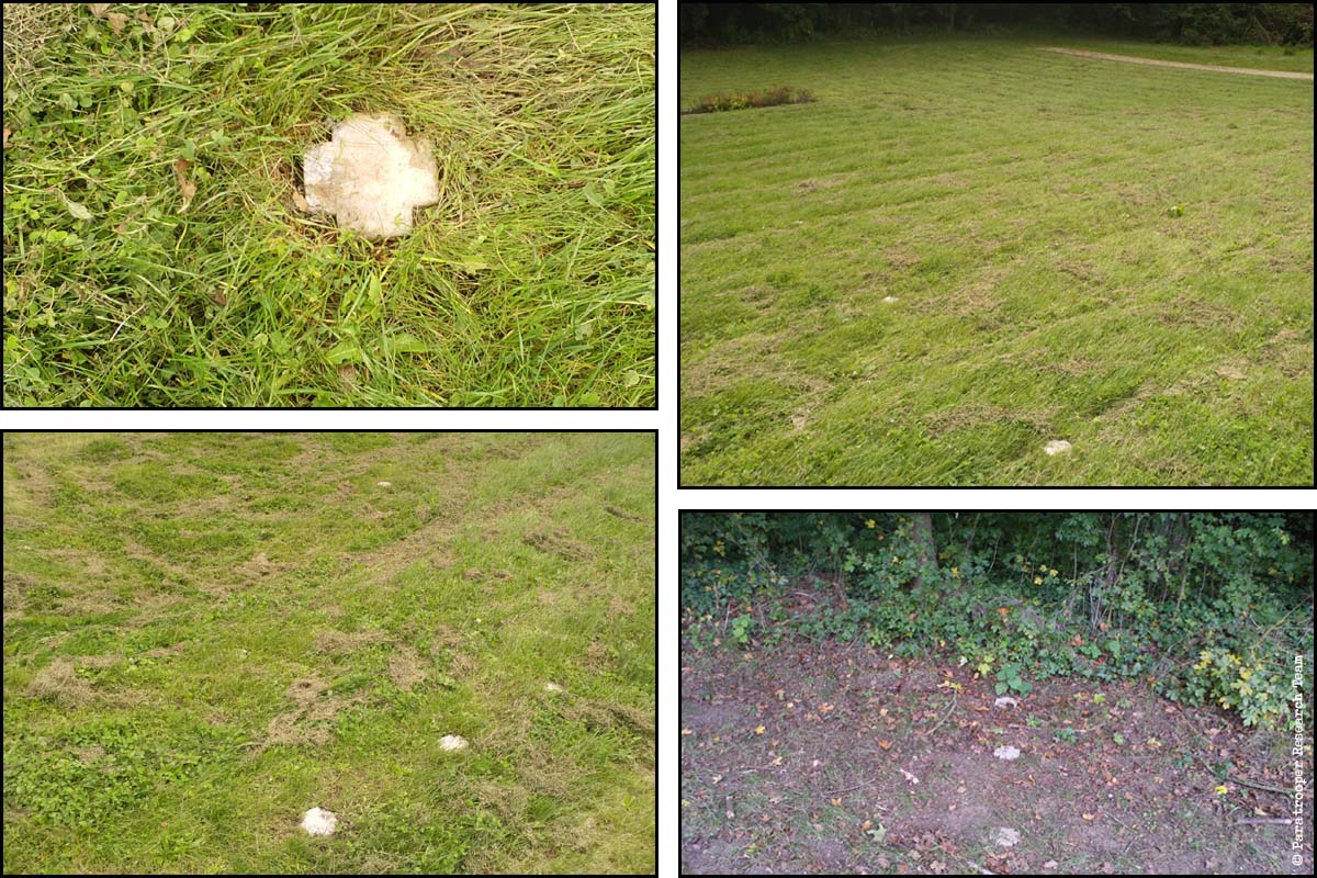 Underneath the grass, that had been mowed not too long ago, judging by the dried out cuttings on top of the fresh grass, we found two little stones. You see them?