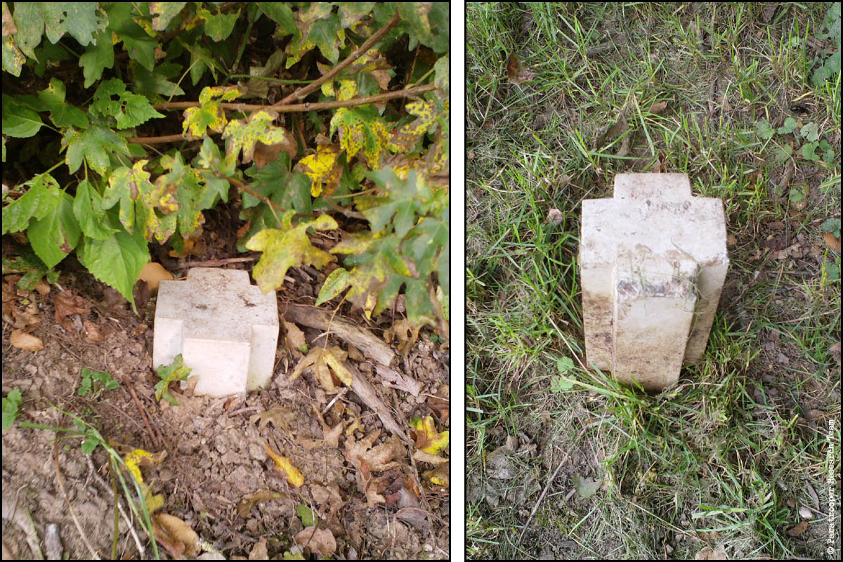 At the left side of the cemetery, there is a concrete structure with inscriptions on both sides. On top a piece of paper where once a plaque was. The plaque was stolen in 2012.