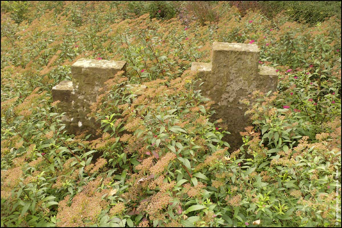 First view of the Perl-Besch WWII Cemetery. At the right, the three crosses, standing atop the remains of a Westwall bunker. At the left the flower field with German graves.